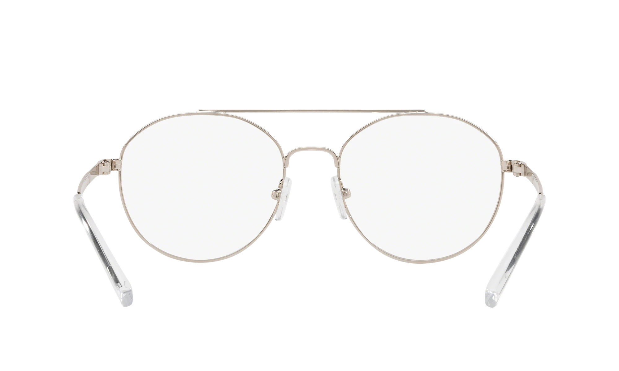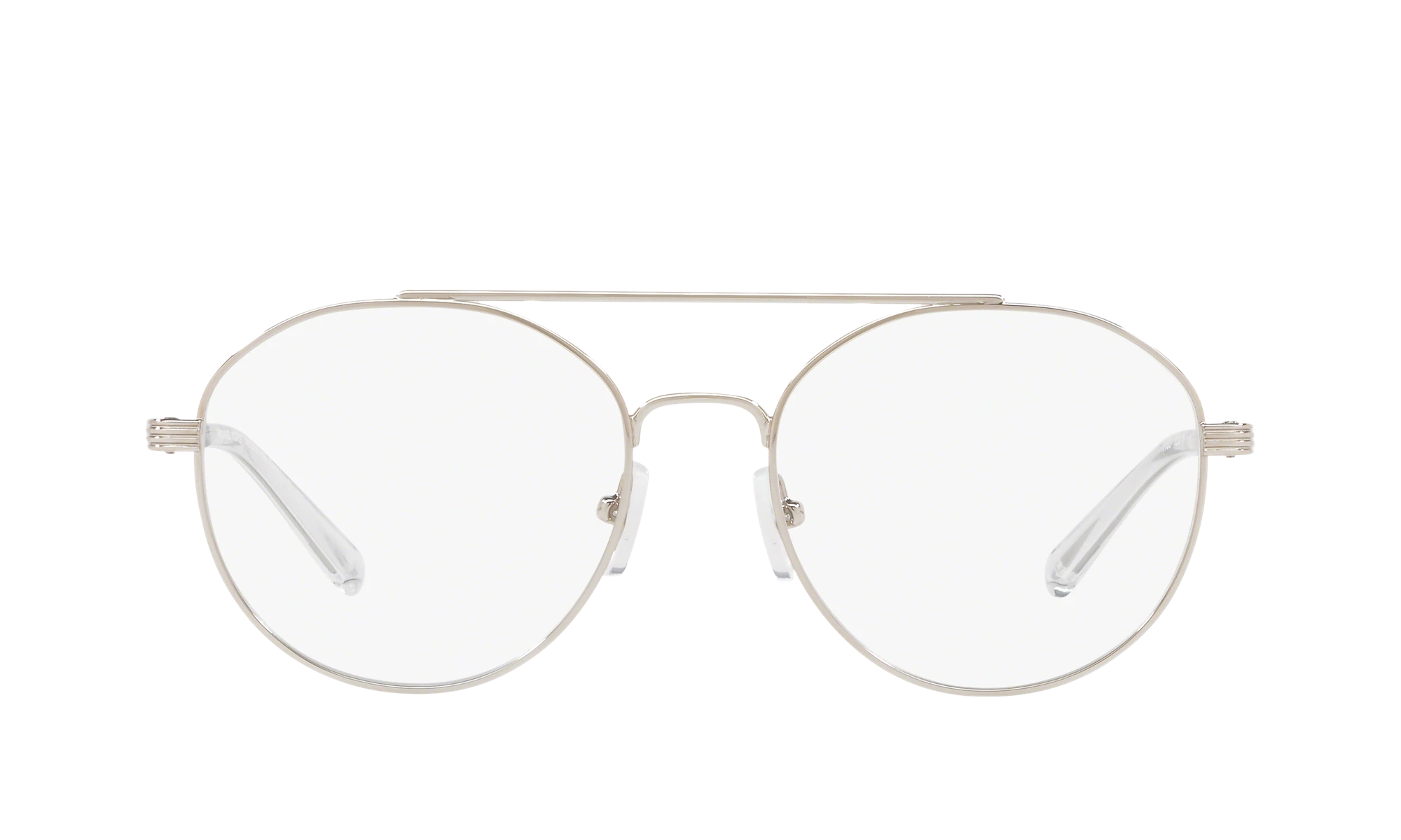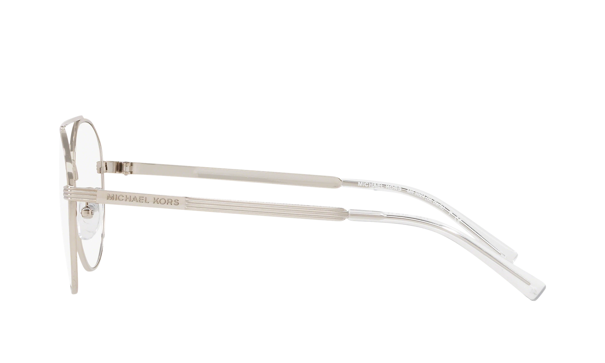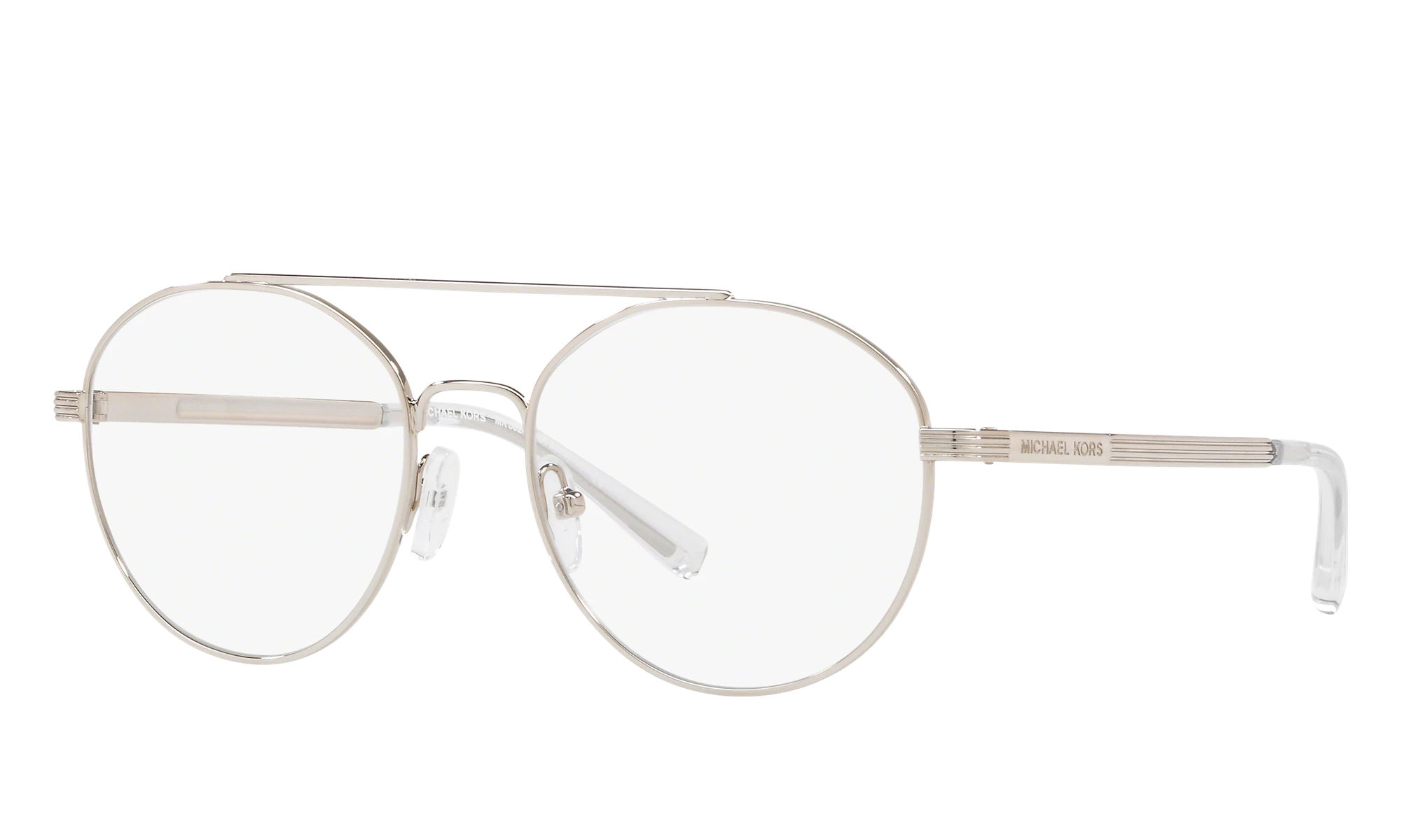 Elevate your eyewear game with Michael Kors St. Barts. The irregular shape and polished metal frame in silver color offer a unique and sophisticated look. Crafted from the finest materials, these eyeglasses are designed to last and provide comfort throughout the day. These frames are a versatile choice for everyday wear, ensuring you always look stylish while keeping your vision sharp. Available with prescription lenses.