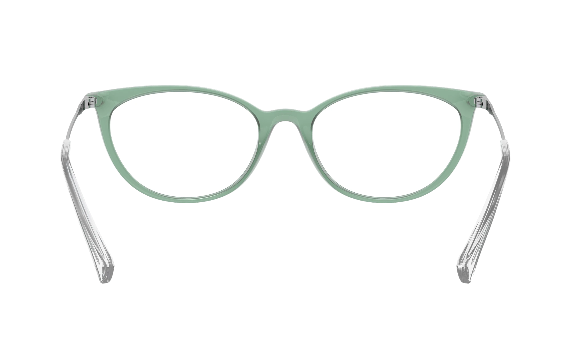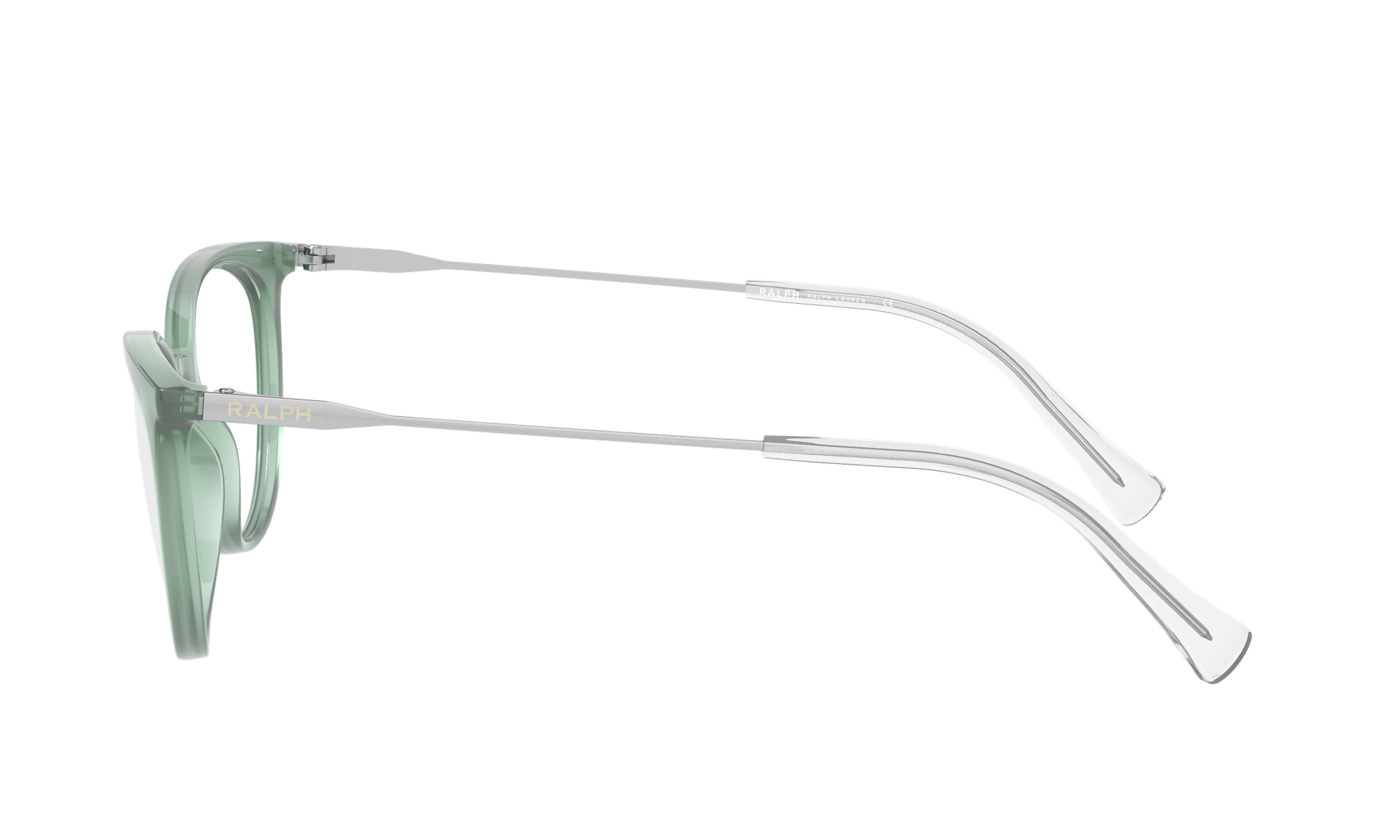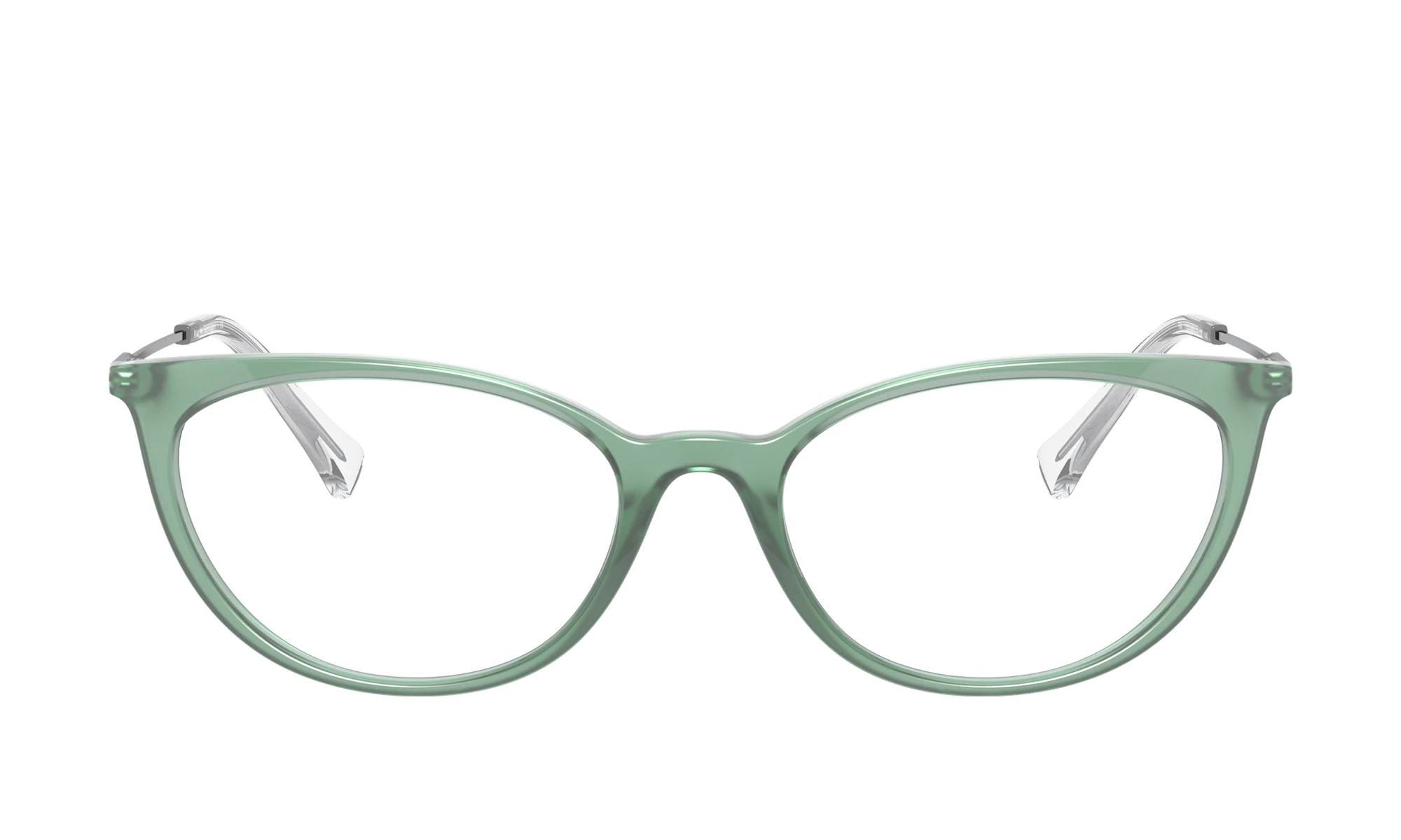 Elevate your fashion with the Ralph RA7123. The cat eye shape adds a touch of vintage charm, while the polished finish and shiny transparent frame color give it a modern twist. These eyeglasses are not just stylish but also practical, making them an ideal choice for everyday wear. Embrace your unique style with these chic frames in a stunning shade of sage green. Available with prescription lenses.
